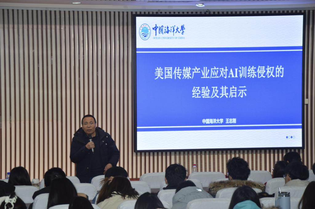 2月26日,人文社科处主办、人文与外国语学院承办的礼贤人文大讲堂第七十一讲在主教学楼东报告厅举行。中国海洋大学文学与新闻传播学院教授、博士生导师王志刚受邀作题为《美国传媒产业应对AI训练侵权的经验及其启示》的专题报告。讲座由人文与外国语学院网络与新媒体专业教研室主任常宁主持,网络与新媒体专业本科生、新闻与传播专业硕士生及学院部分教师参加讲座。