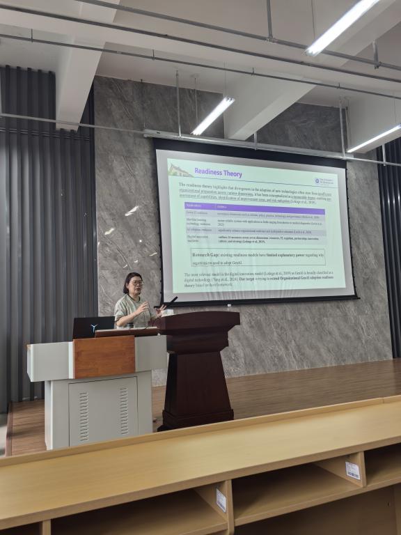徐东溟从上市公司对采用生成式人工智能持怀疑态度的现象出发,构建了生成式人工智能采纳的组织准备理论框架,包括资源准备、IT准备、认知准备、伙伴关系准备、创新潜力、战略准备、文化准备和IT治理准备等8个部分。她指出,该框架推进了生成式人工智能采纳的理论研究,并通过整合大语言模型和话语分析,丰富了理论构建方法,是一种可扩展、易操作的理论构建方法。互动环节,徐东溟热情与师生就大语言模型数据处理、AI日常使用等进行了讨论。