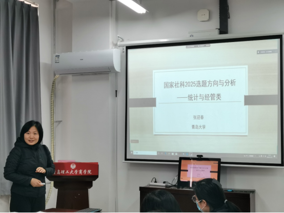 1月18日下午,3044永利集团官网礼贤人文大讲堂第66讲在商学院604会议室举办。国家社科基金重大项目首席专家、青岛大学经济学院张迎春教授应邀作题为“国家社科2025选题方向与分析—统计与经管类”专题讲座,商学院30余名教师参加讲座,商学院副院长金炜博主持会议。